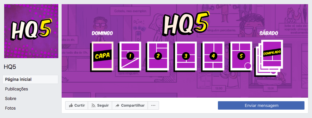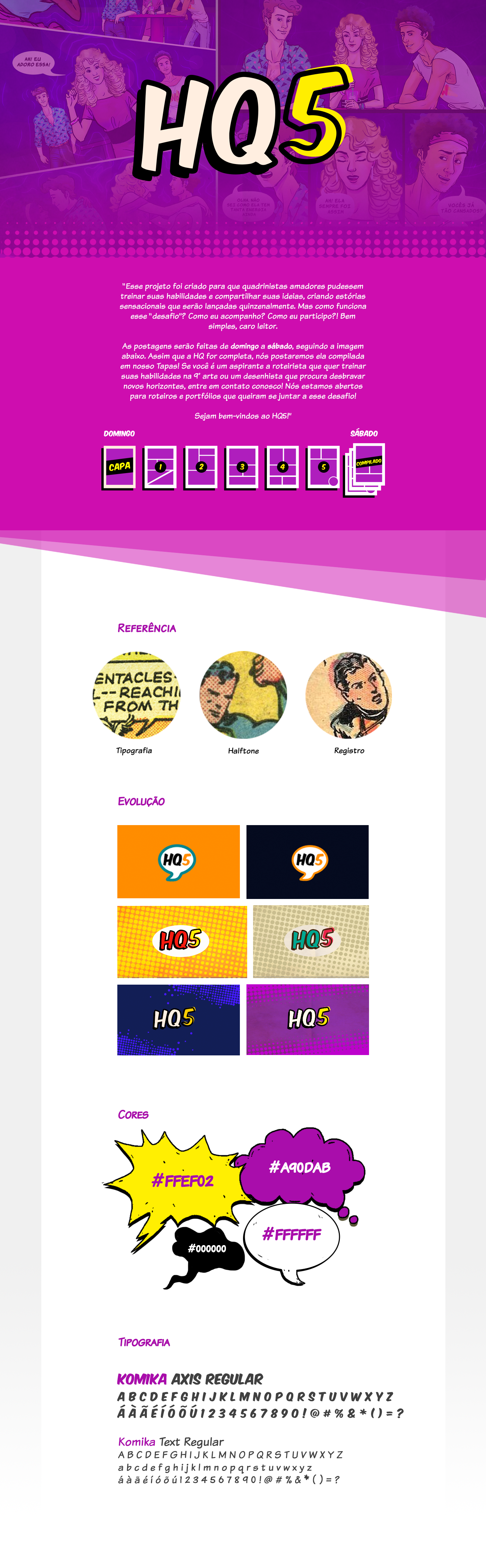 Identidade visual para o projeto HQ5. Ele divulga histórias em quadrinho de cinco páginas semanalmente, de segunda a sexta.